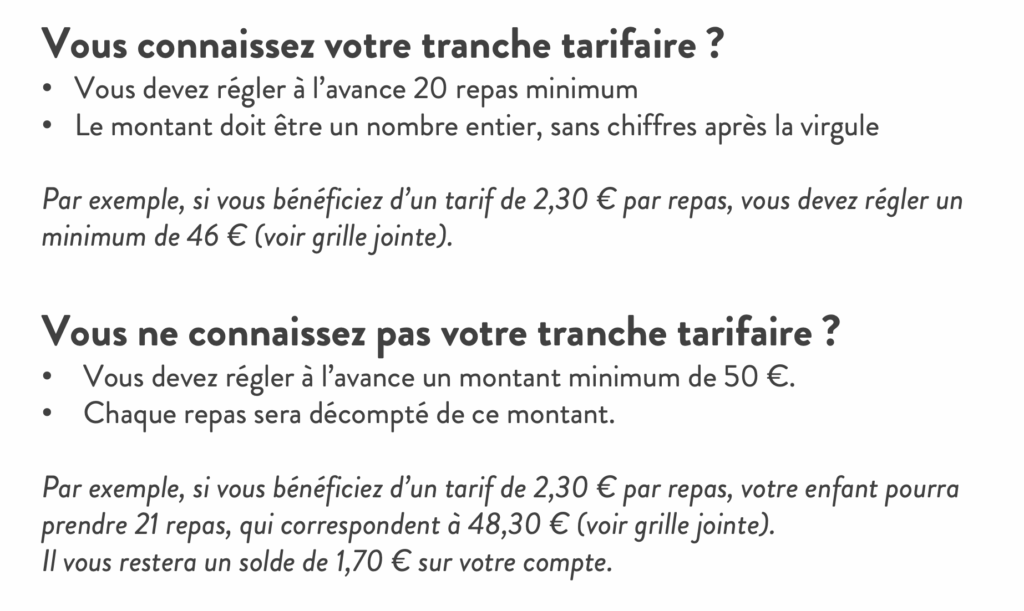 Par exemple, si vous bénéficiez d’un tarif de 2,30 € par repas, vous devez régler un minimum de 46 € (voir grille jointe).