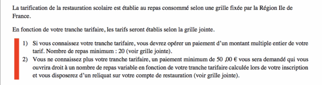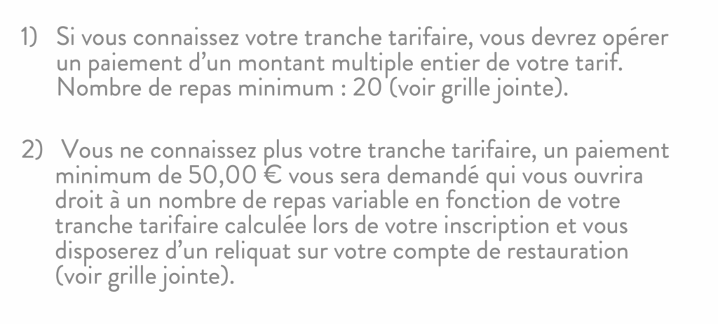 2) Vous ne connaissez plus votre tranche tarifaire, un paiement minimum de 50,00 € vous sera demandé qui vous ouvrira droit à un nombre de repas variable en fonction de votre tranche tarifaire calculée lors de votre inscription et vous disposerez d’un reliquat sur votre compte de restauration (voir grille jointe).