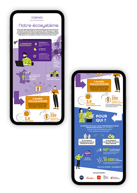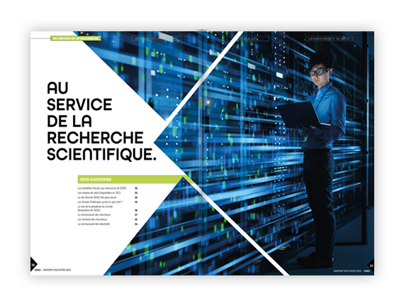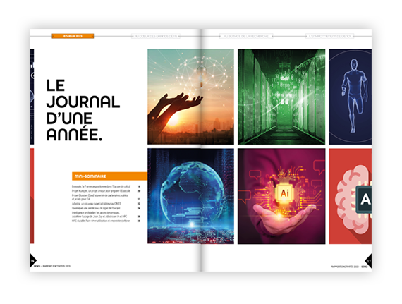 Nous avons contribué à développer l’identité scientifique de GENCI à travers des codes, des tonalités et des territoires d’information clairs et cohérents. Cela s’est traduit, entre autres, par :